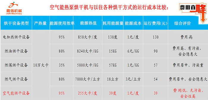 設(shè)備只需消耗少量的電能,就可以在空氣中吸收大量的熱量,耗電量僅為電加熱器的1/4;同燃煤、油、燃氣烘干機相比,可節(jié)省70%左右的運行費用。1度電等于4度電。